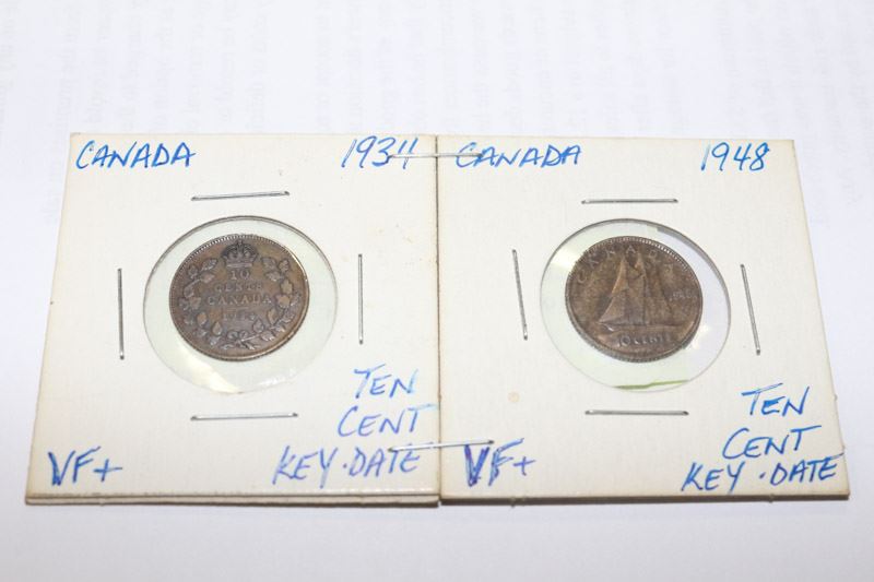 TWO "KEY DATE" CANADIAN SILVER DIMES, BOTH HAVE VERY NICE TONED PATINA, EXCELLENT ADDITIONS TO ANY COLLECTION. THIS LOT SOLD 2 TIMES THE MONEY.