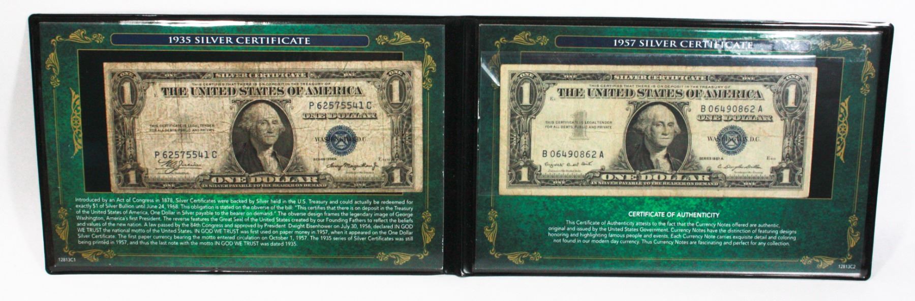 PRESENTATION SET. 1935 A USA $1.00 BILL (IN SILVER PAYABLE TO BEARER), 1957 USA $1.00 BILL (IN SILVER PAYABLE TO THE BEARER). NO LONGER PRINTED FOR SILVER