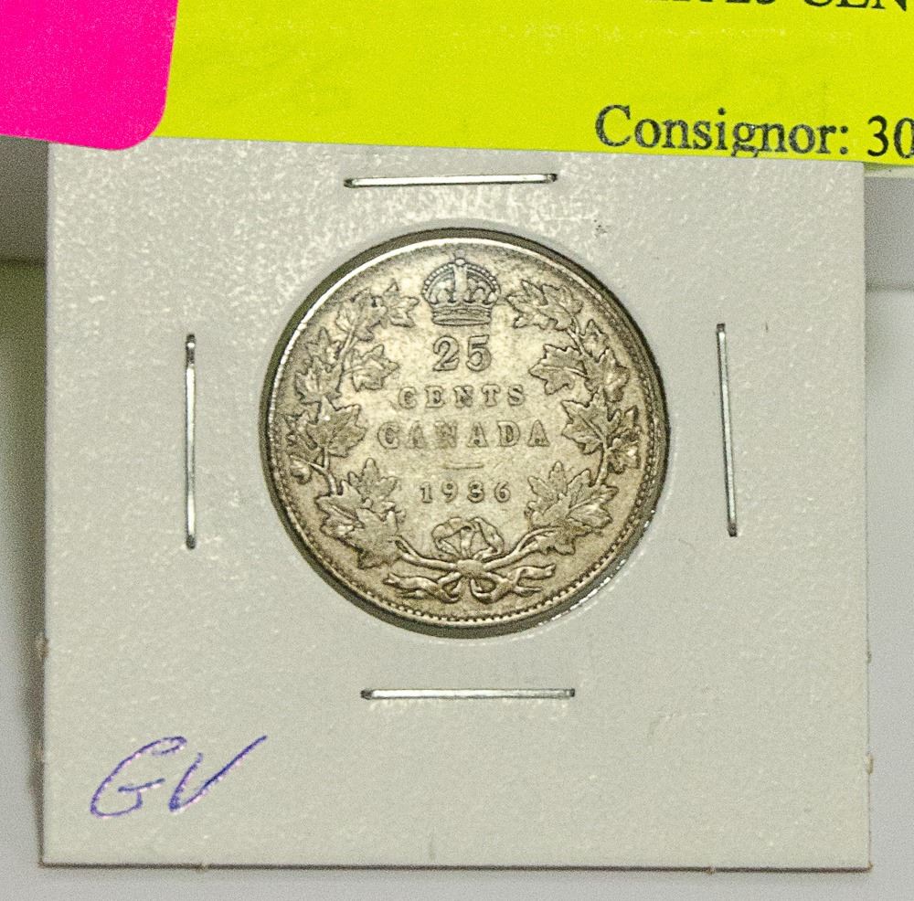 1936 CANADIAN GV SILVER 25 CENT COIN