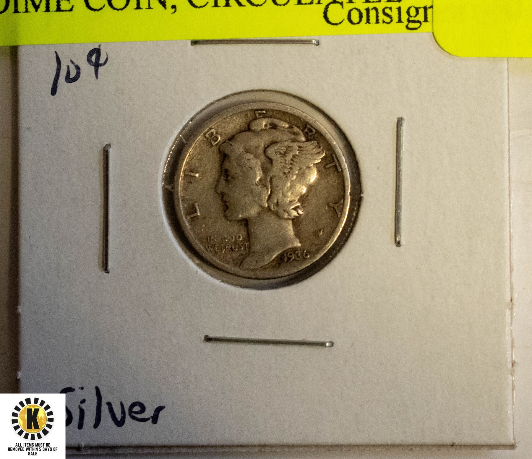 1936 SILVER USA MERCURY ONE DIME COIN, CIRCULATED