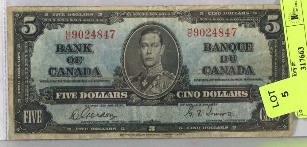 1937 CANADIAN $5 BILL.
