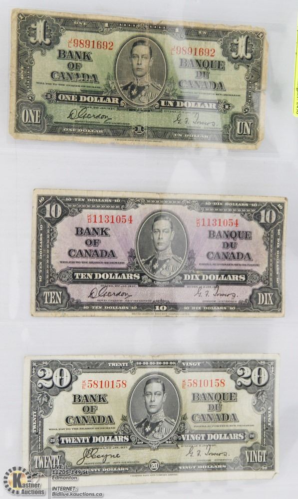 SHEET OF 3 1937 $1 BANK OF CANADA NOTES. $1 , $10 , $20. GORDON TOWERS COYNE IN PROTECTIVE SHEET.