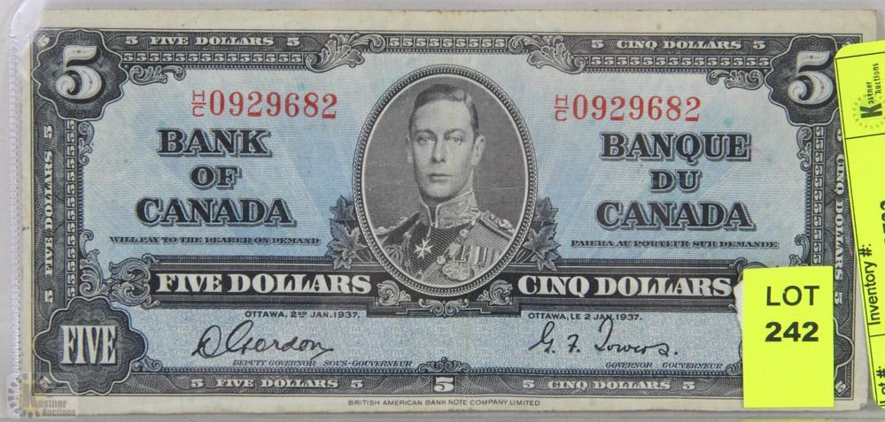 1937 CANADIAN FIVE DOLLAR BILL $5