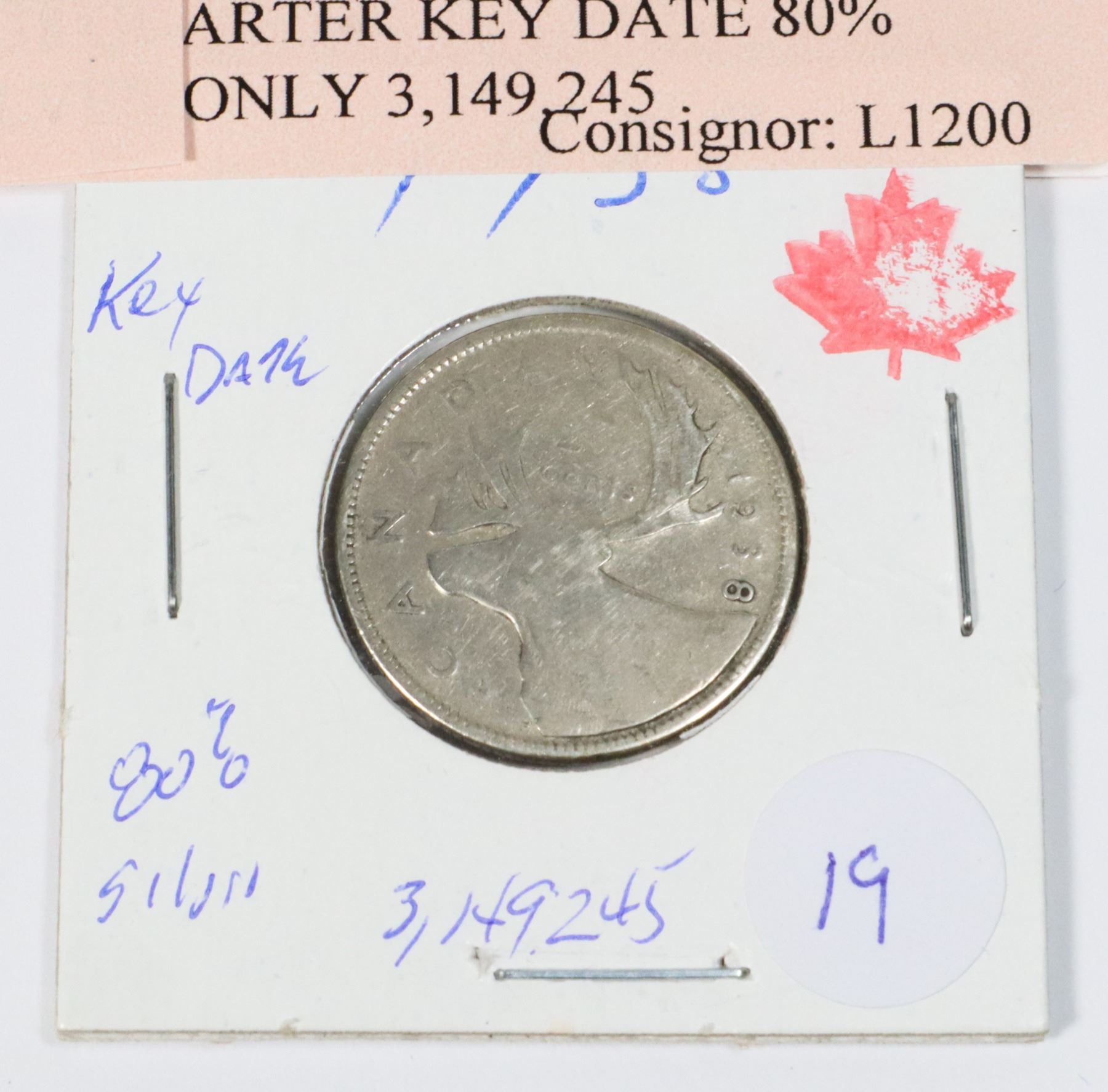 MINTED. PART OF GOV'T RECALL 2020 NO LONGER CIRCULATING COINAGE. 1938 25 cent piece only 3,149,245 Minted key Date many now turned into Gov't of Canada for Melt Look Closely at the details in the coin