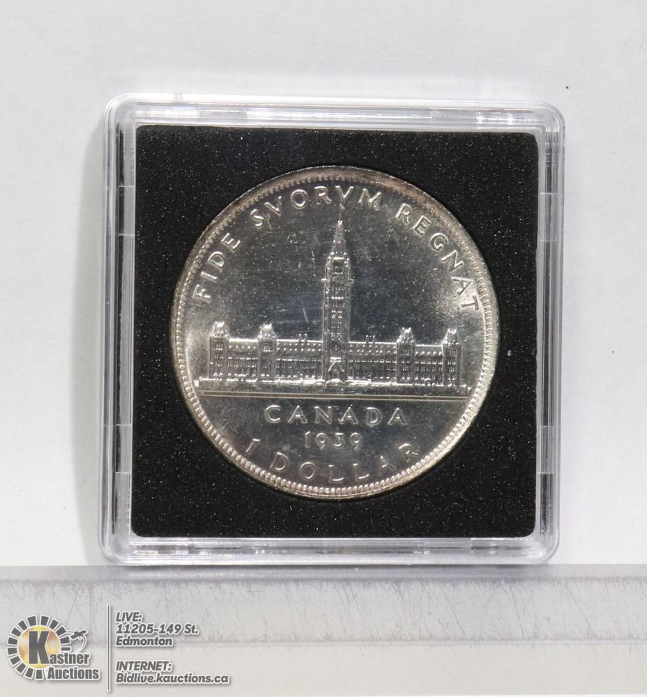 COMMEMORATIVE DOLLAR ISSUED IN 1939 FOR THE ROYAL VISIT TO CANADA WITH PARLIAMENT BUILDINGS ON FRONT. EXCELLENT SHAPE.