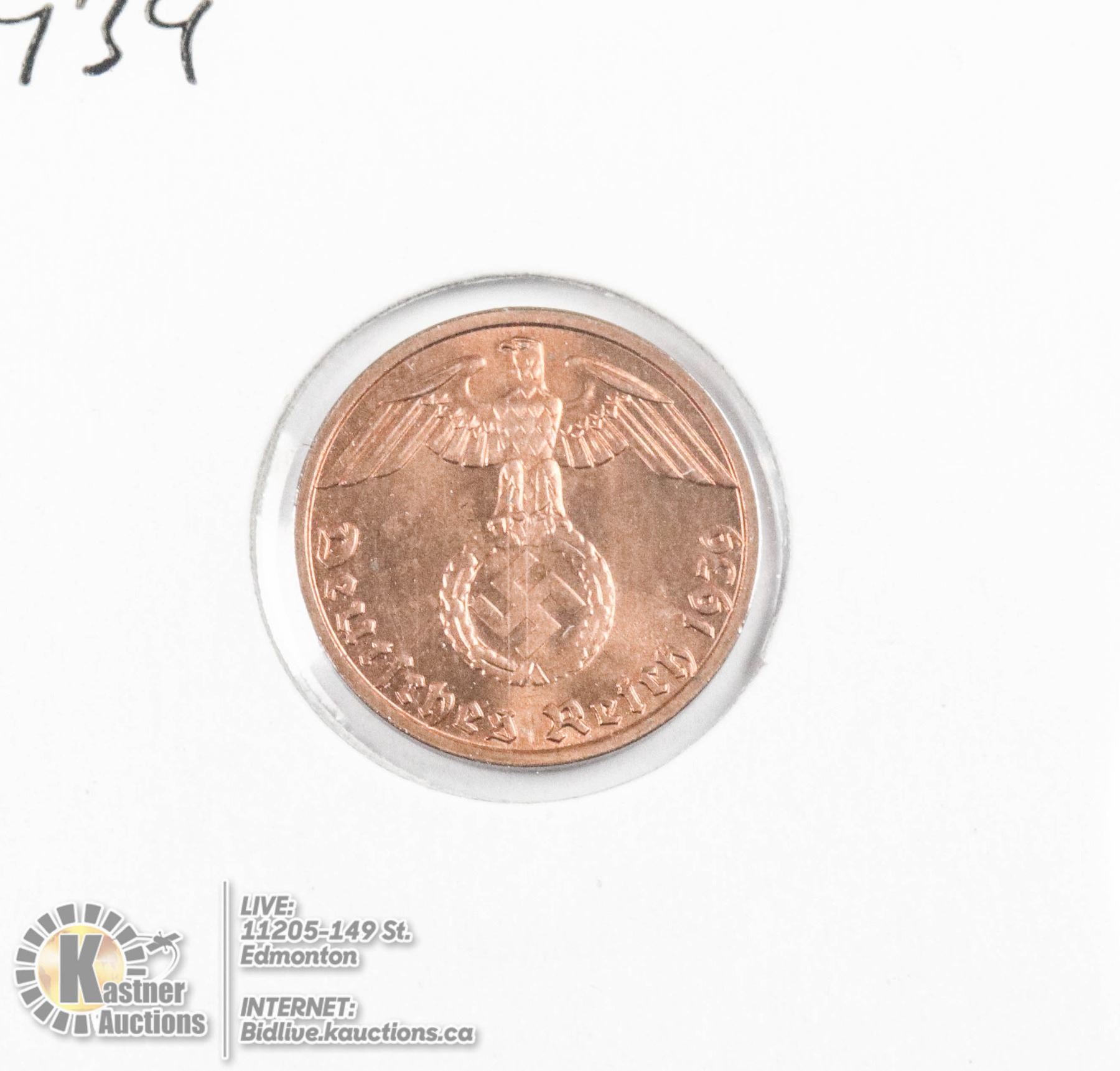 1939 WWII NAZI GERMANY 1 REICHSPFENNIG COIN, UNC.