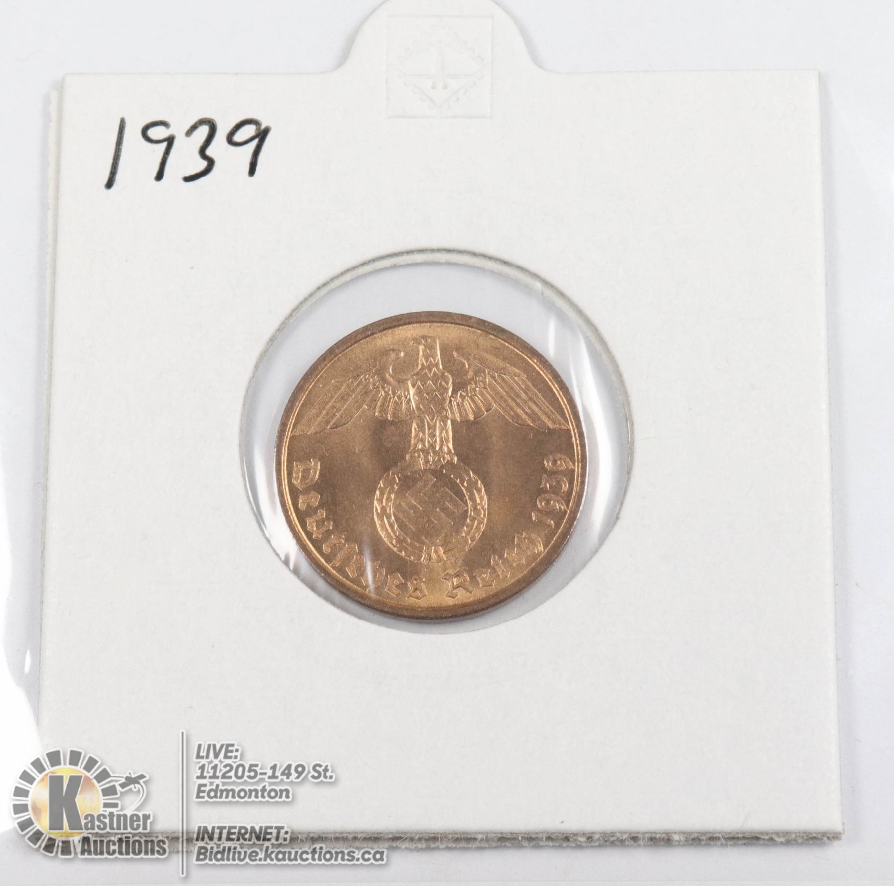 1939 WWII NAZI GERMANY 2 REICHSPFENNIG COIN, UNC.