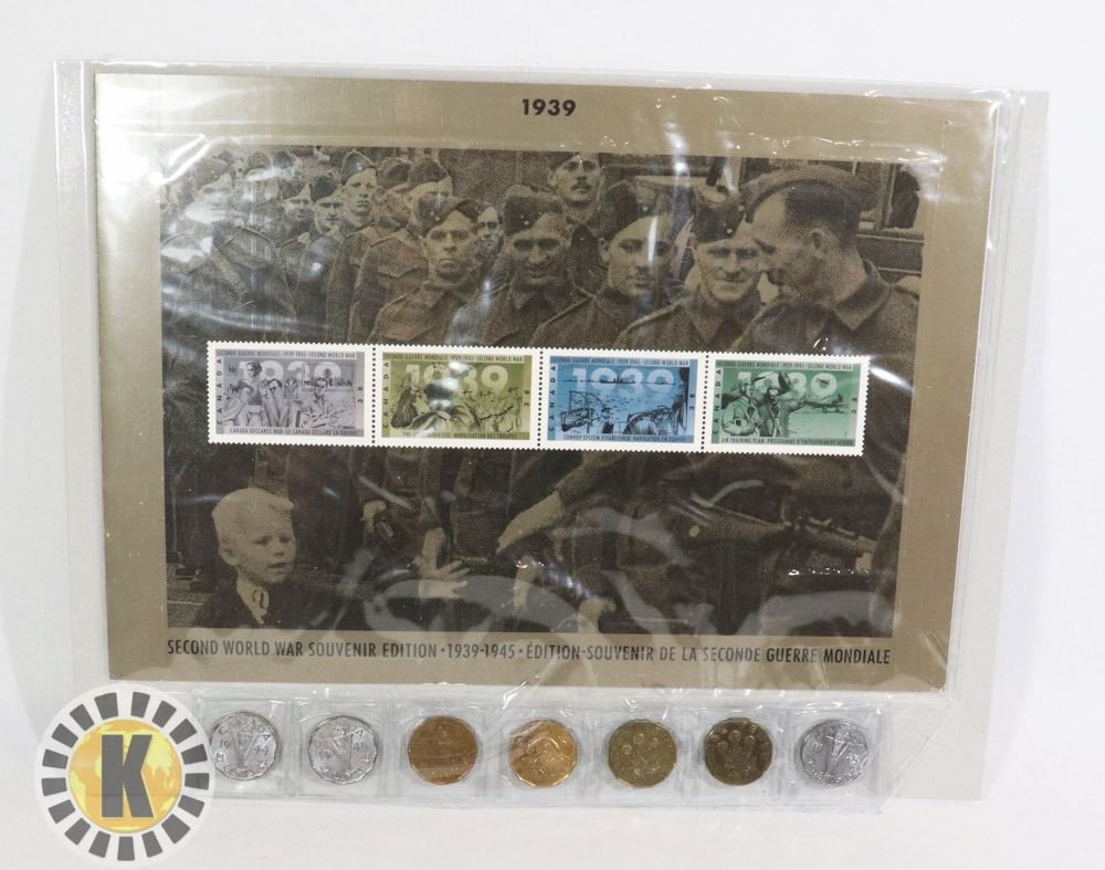 A WWII CANADA POST SOUVENIR STAMP COLLECTION FROM 1939, + A COLLECTION OF NICKELS THAT WERE MADE FROM MANY DIFFERENT MATERIALS IN CANADA DURING WWII.***ITEM IS LOCATED IN LETHBRIDGE ALBERTA, PICKUP IS AT OUR LETHBRIDGE LOCATION ONLY, WORLDWIDE SHIPPING IS AVAILABLE***
