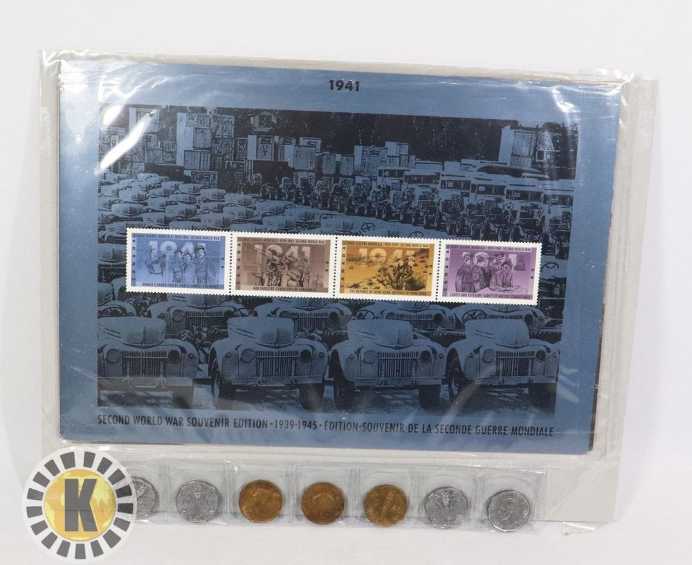A WWII CANADA POST SOUVENIR STAMP COLLECTION FROM 1941, + A COLLECTION OF NICKELS MADE FROM MANY DIFFERENT MATERIALS DURING WWII.***ITEM IS LOCATED IN LETHBRIDGE ALBERTA, PICKUP IS AT OUR LETHBRIDGE LOCATION ONLY, WORLDWIDE SHIPPING IS AVAILABLE***