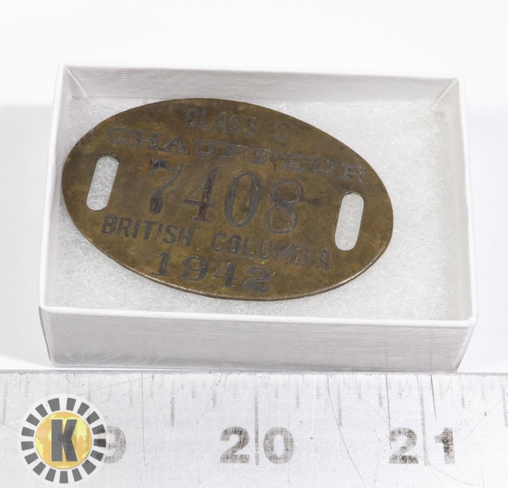 NICE DARK PATINA CHAUFFEUR LICENSE BADGE FROM BRITISH COLUMBIA 1942***ITEM IS LOCATED IN LETHBRIDGE ALBERTA, PICKUP IS AT OUR LETHBRIDGE LOCATION ONLY, WORLDWIDE SHIPPING IS AVAILABLE***