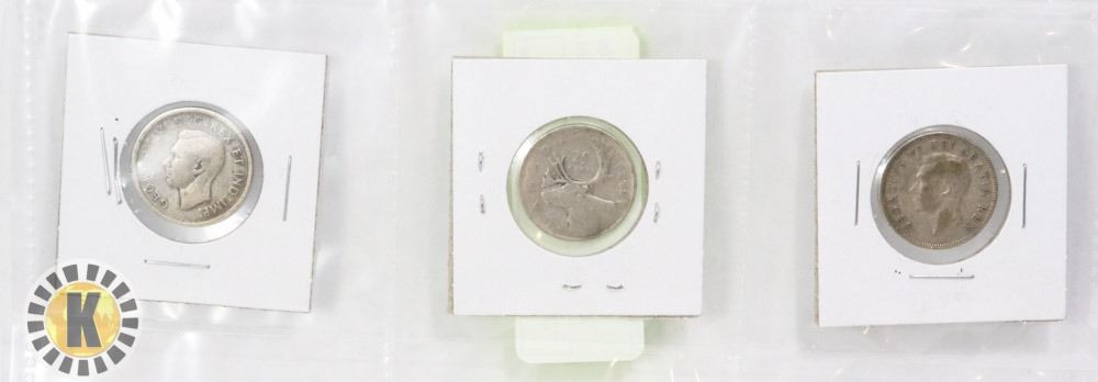 1945, 1938, 1951 $.25, KING GEORGE, 80% SILVER