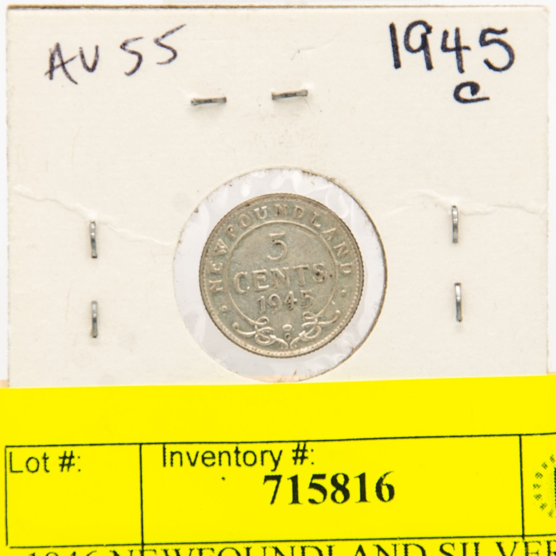 1945 NEWFOUNDLAND SILVER FIVE CENT AU55