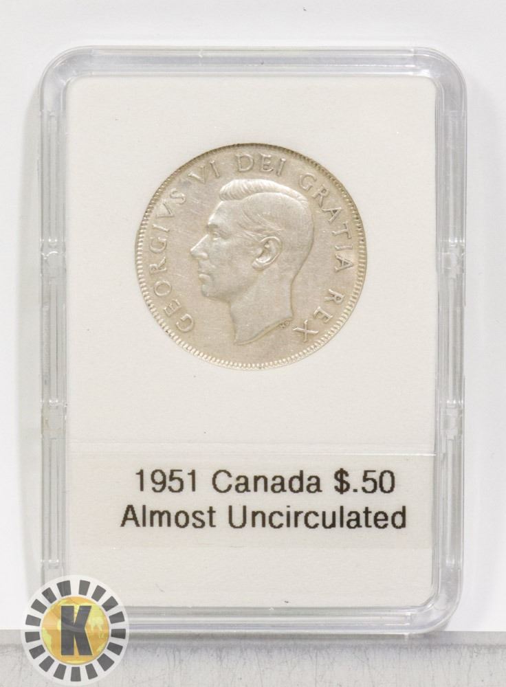 UNCIRCULATED 1951 SILVER HALF DOLLAR, AN EXCELLENT EXAMPLE OF THE YEAR.***ITEM IS LOCATED IN LETHBRIDGE ALBERTA, PICKUP IS AT OUR LETHBRIDGE LOCATION ONLY, WORLDWIDE SHIPPING IS AVAILABLE***