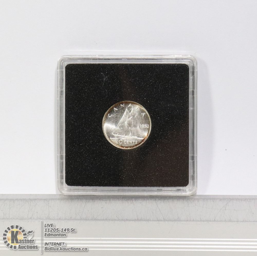 FIRST YEAR OF ELIZABETH II, THIS GEM UNCIRCULATED EXAMPLE HAS THE NO-SHOULDER FOLD VARIETY.