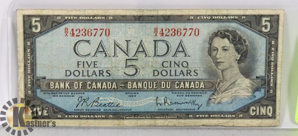 1954 CANADIAN $5 BILL SERIAL BX4236770 B/R