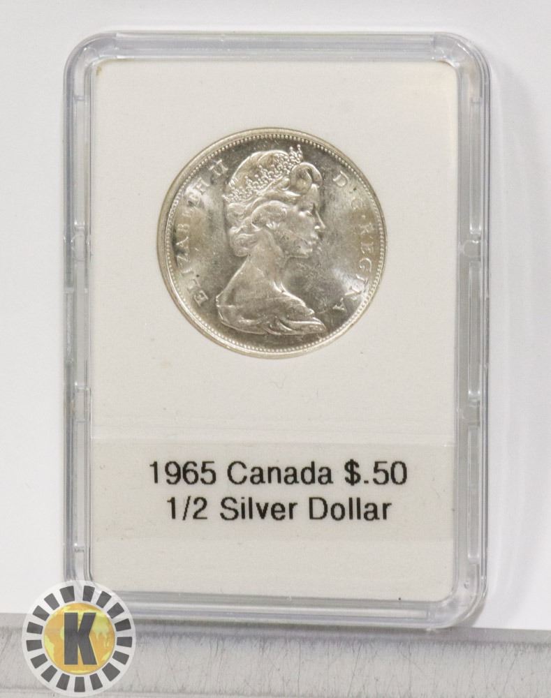 1965 SILVER HALF DOLLAR,, AN EXCELLENT EXAMPLE OF THE YEAR.***ITEM IS LOCATED IN LETHBRIDGE ALBERTA, PICKUP IS AT OUR LETHBRIDGE LOCATION ONLY, WORLDWIDE SHIPPING IS AVAILABLE***
