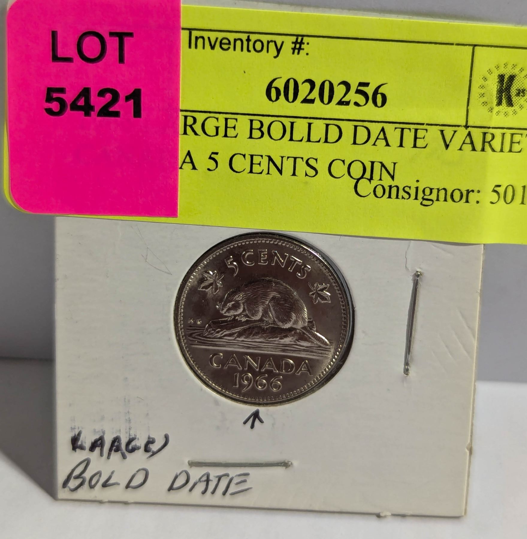 1966 LARGE BOLLD DATE VARIETY CANADA 5 CENTS COIN