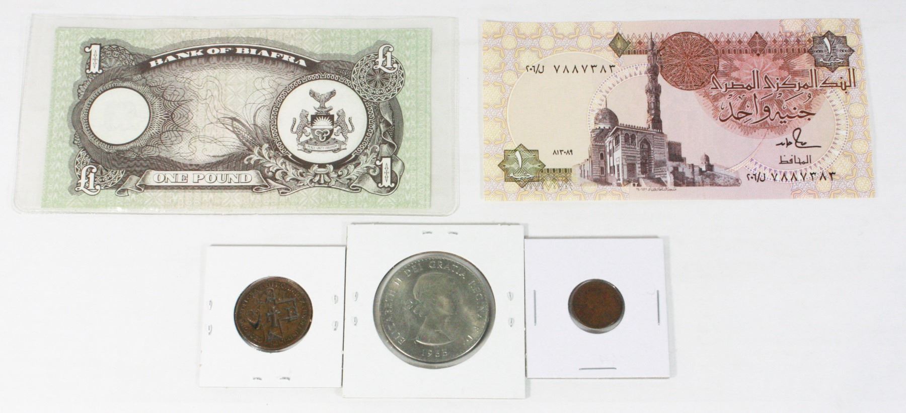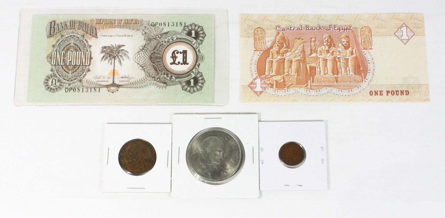 WITH 1978-1985 EGYPT 1 POUND BANKNOTE BILL, AND 1901 BRITISH INDIA 1/12 ANNA COIN VICTORIAN, OVER STAMPED COIN 1912 BRITISH HALF PENNY (RE-ENGRAVED DESIGN HEART CROSS B A UNITED KINGDOM BRITISH EMPIRE), AND BRITISH WINSTON CHURCHILL 1965 COIN TOKEN