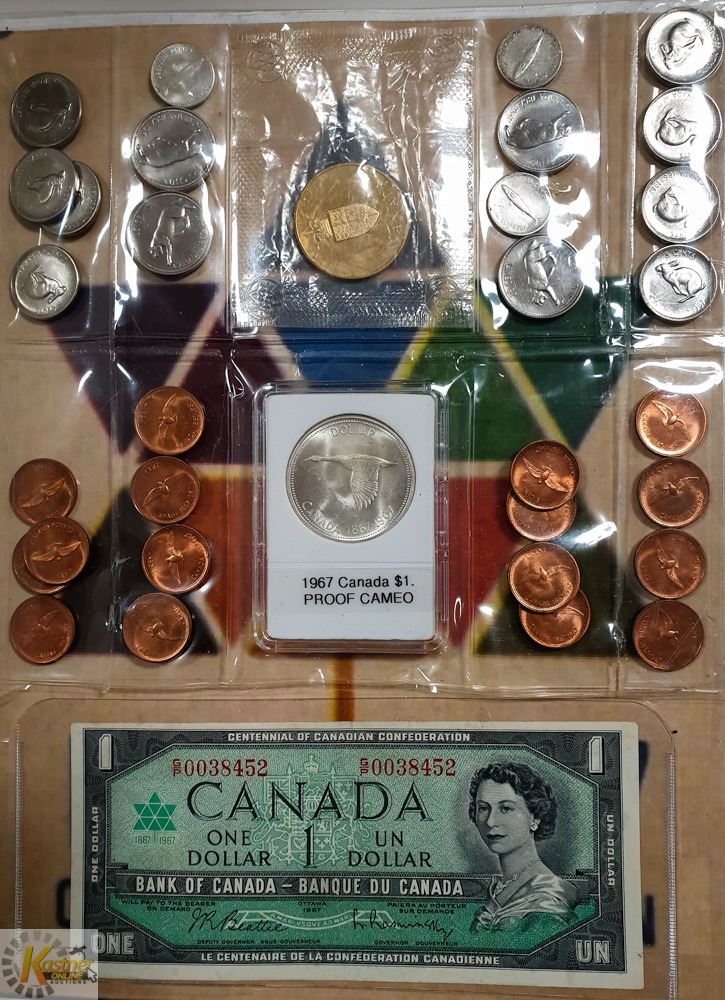 CURRENCY. 1967 PROOFLIKE SILVER $1, + 1967 $.01, $.05, $.10, $.25, $1.00, SET FROM $.01 - $.25, 1967 CENTENNIAL MEDALLION