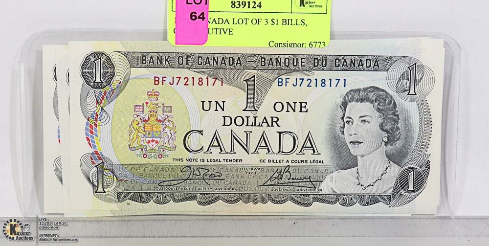 1973 CANADA LOT OF 3 $1 BILLS, CONSECUTIVE