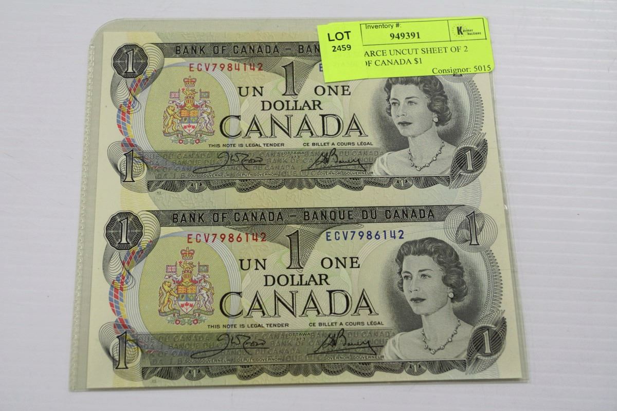 1973 SCARCE UNCUT SHEET OF 2 BANK OF CANADA $1