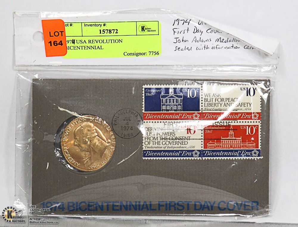 FIRST DAY COVER STAMPS AND JOHN ADAMS MEDALLION. MINT SEALED WITH INFO CARD INSIDE -COINS & CURRENCY