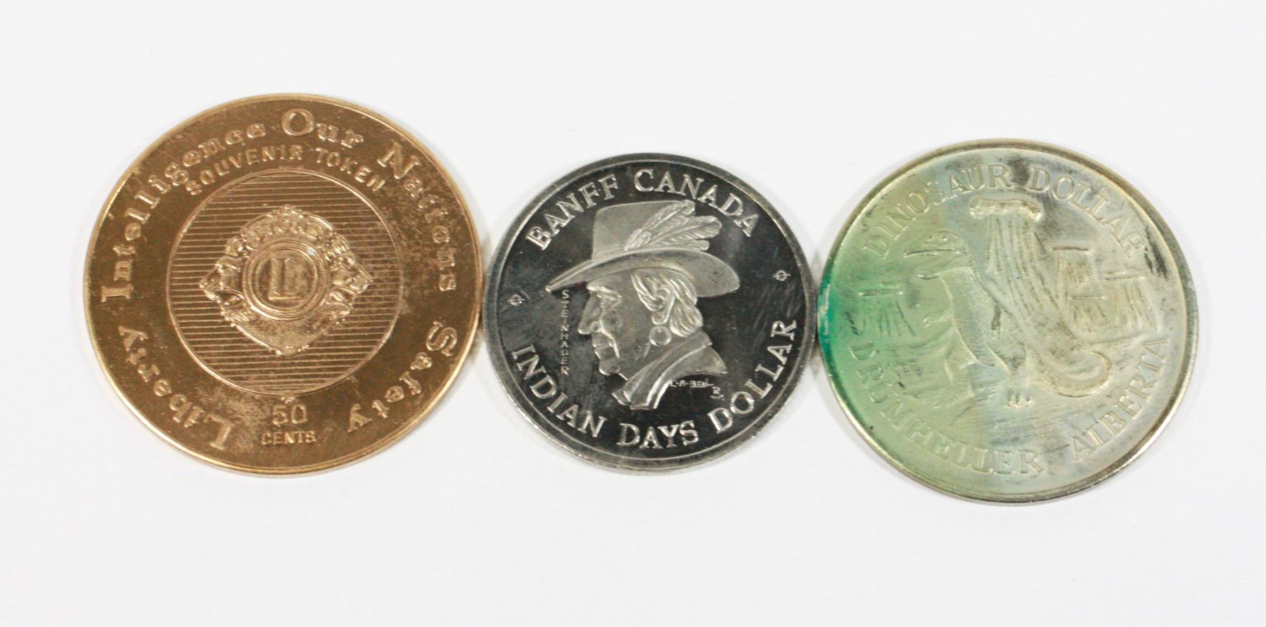 WITH 1966 BROOKS ALBERTA SPORTSMAN'S PARADISE COIN, AND DINOSAUR DOLLAR DRUMHELLER ALBERTA 1975