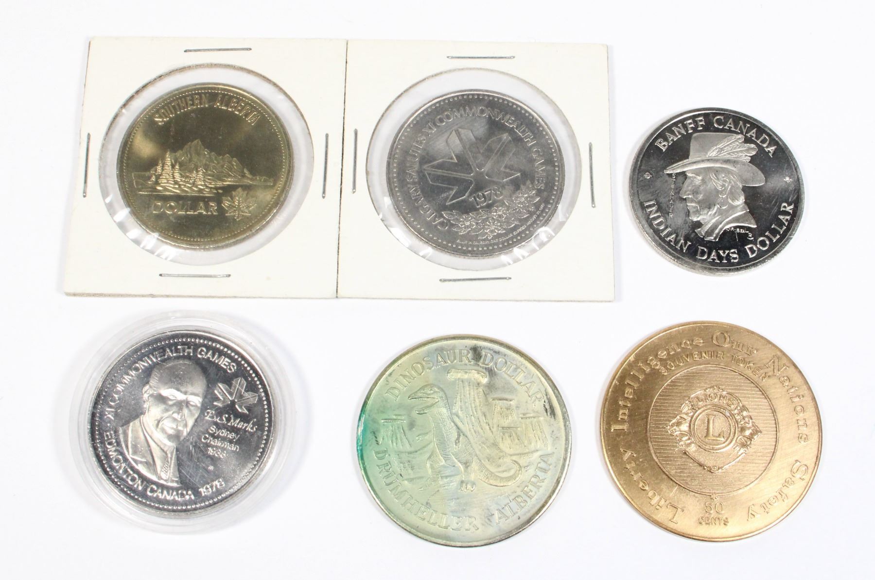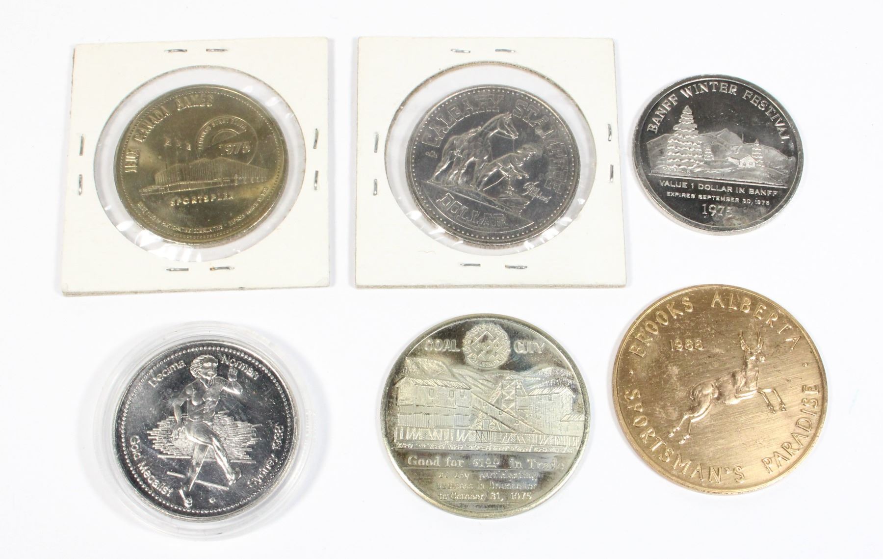 WITH 1966 BROOKS ALBERTA SPORTSMAN'S PARADISE COIN, AND DINOSAUR DOLLAR DRUMHELLER ALBERTA 1975, AND MORE TOKENS