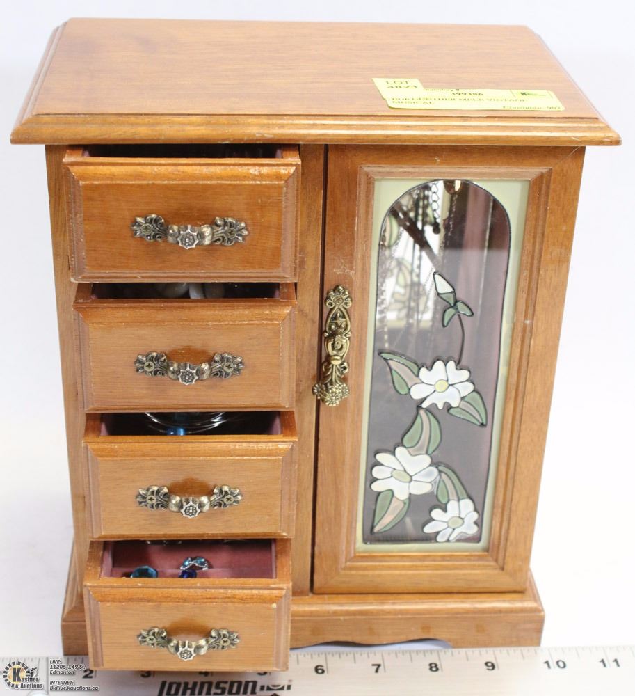 JEWELRY BOX W/4 DRAWERS INCL. RING DRAWER & NECKLACE HANGER - FULL OF JEWELRY
