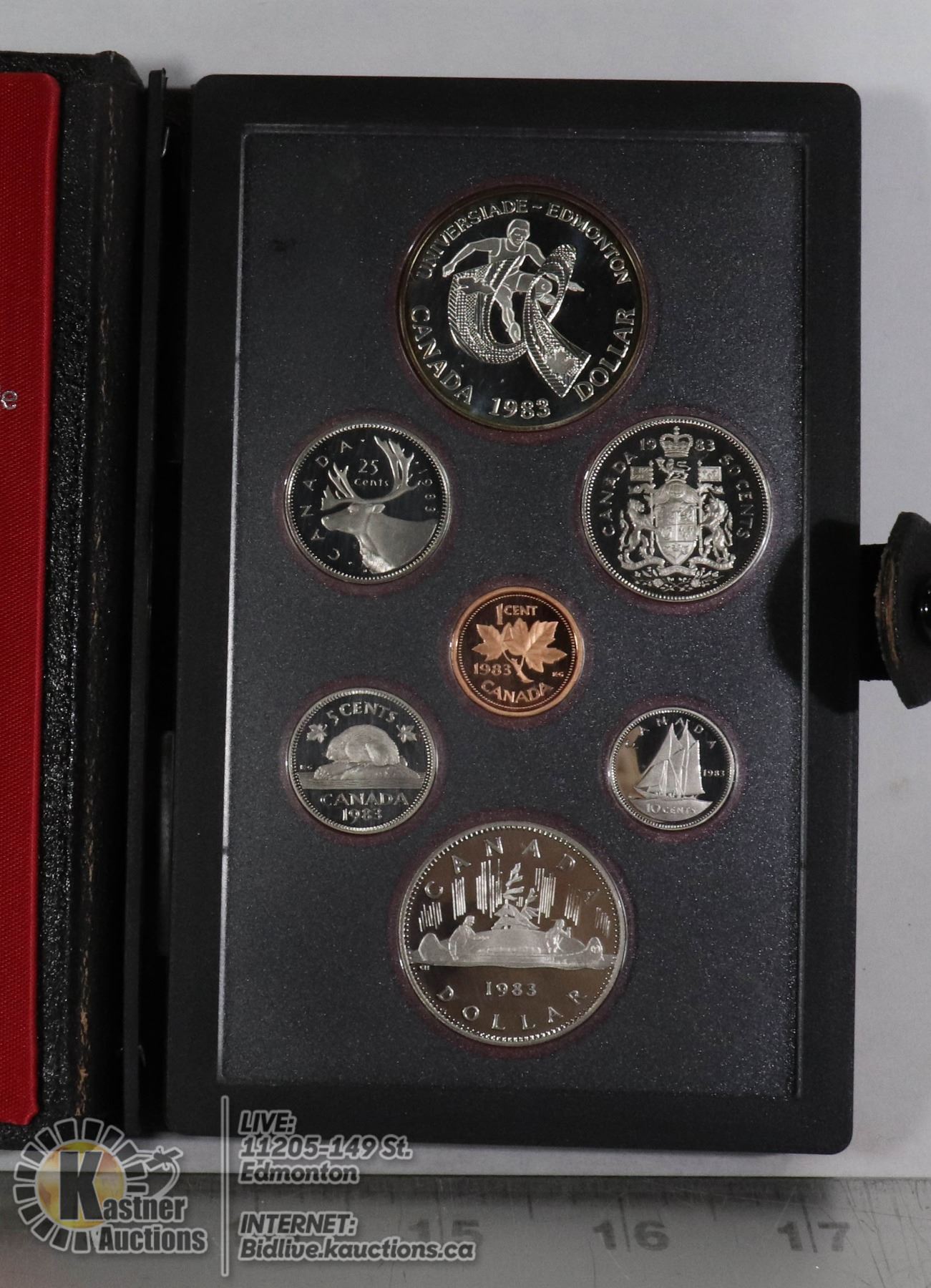 1983 PROOF SETT OF CANADIAN COINAGE. THE 1983 CANADIAN SILVER DOLLAR COMMEMORATES THE WORLD UNIVERSITY GAMES HELD IN EDMONTON, ALBERTA IN JULY OF THAT YEAR.