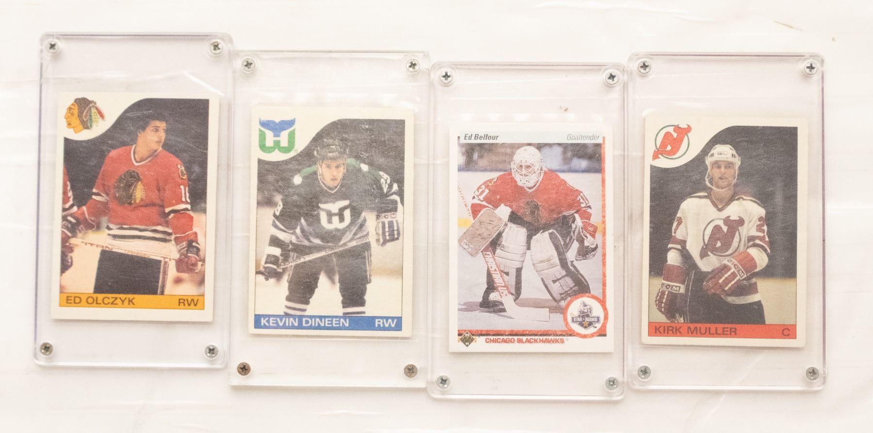 ED BELFOUR CHICAGO BLACKHAWKS HOCKEY CARD + 1985 O PEE CHEE ED OLCZYK HOCKEY CARD + KIRK MULLER 1985 O PEE CHEE HOCKEY CARD