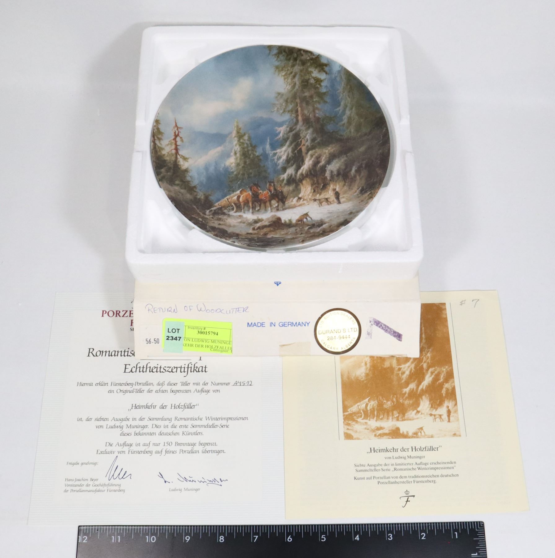 (HOME COMING OF THE LUMBERJACKS) COLLECTOR PLATE CERTIFICATE OF AUTHENTICITY AND PAPERWORK. MADE IN GERMANY. HANGING HOOK ON BACK