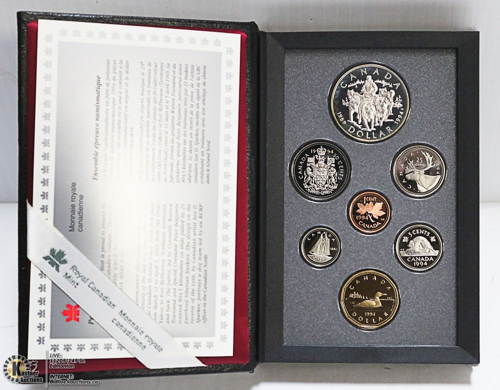 THIS SET FEATURES BOTH THE 1994 SILVER DOLLAR COMMEMORATING THE 25TH ANNIVERSARY OF THE LAST RCMP DOG TEAM PATROL, AND THE AUREATE DOLLAR.