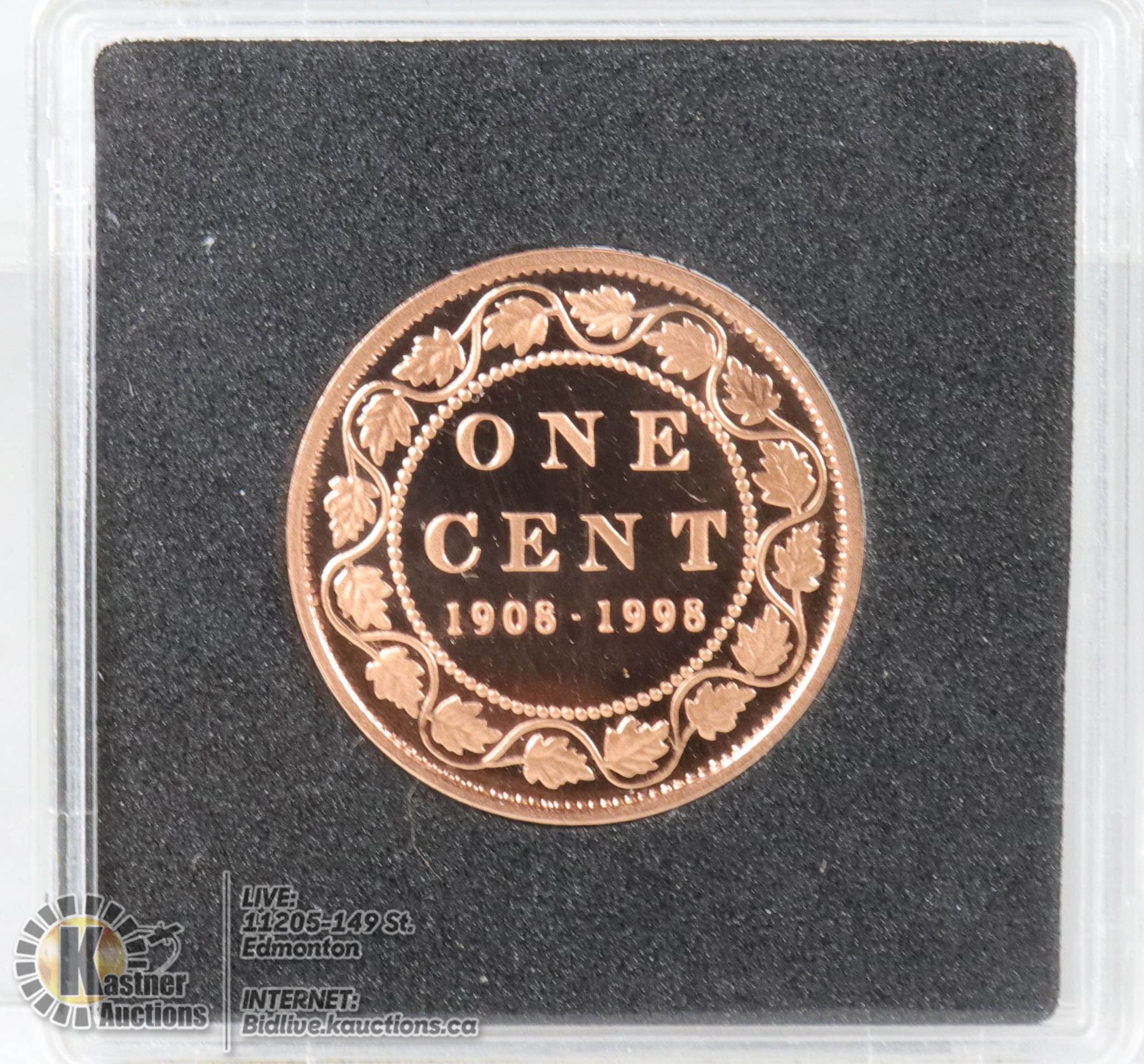 1998 LARGE CENT MINTED BY CANADA FOR THE 90TH ANNIVERSARY OF THE ROYAL CANADIAN MINT. BRILLIANT FROSTED DESIGN AND MIRROR FIELDS. ONLY SOLD TO COLLECTORS IN LIMITED MINTAGE