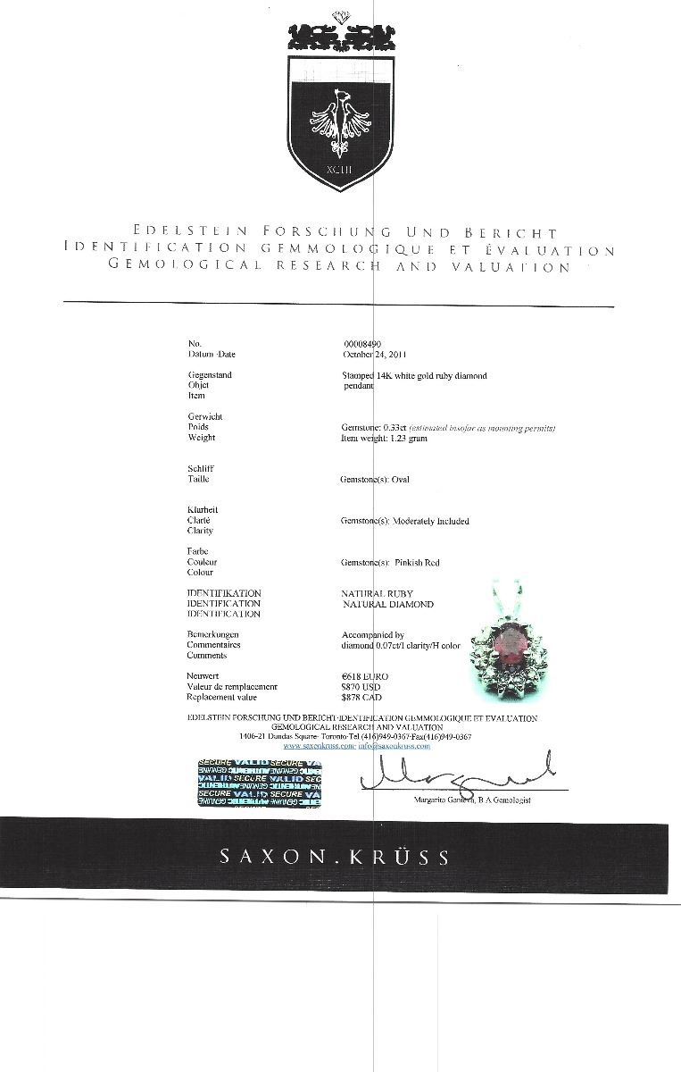 14K WHITE GOLD RUBY(0.33CT) & DIAMOND PENDANT. W/ COA- SUGGESTED REPLACEMENT VALUE $878.00