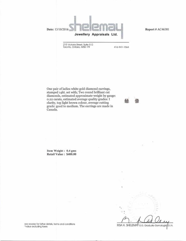 302 - JT39 - 14K WHITE GOLD DIAMOND (0.22CTS) EARRINGS (~WEIGHT 0.4G), MADE IN CANADA W/COA, SUGGESTED RETAIL VALUE $400. JEWELLERY