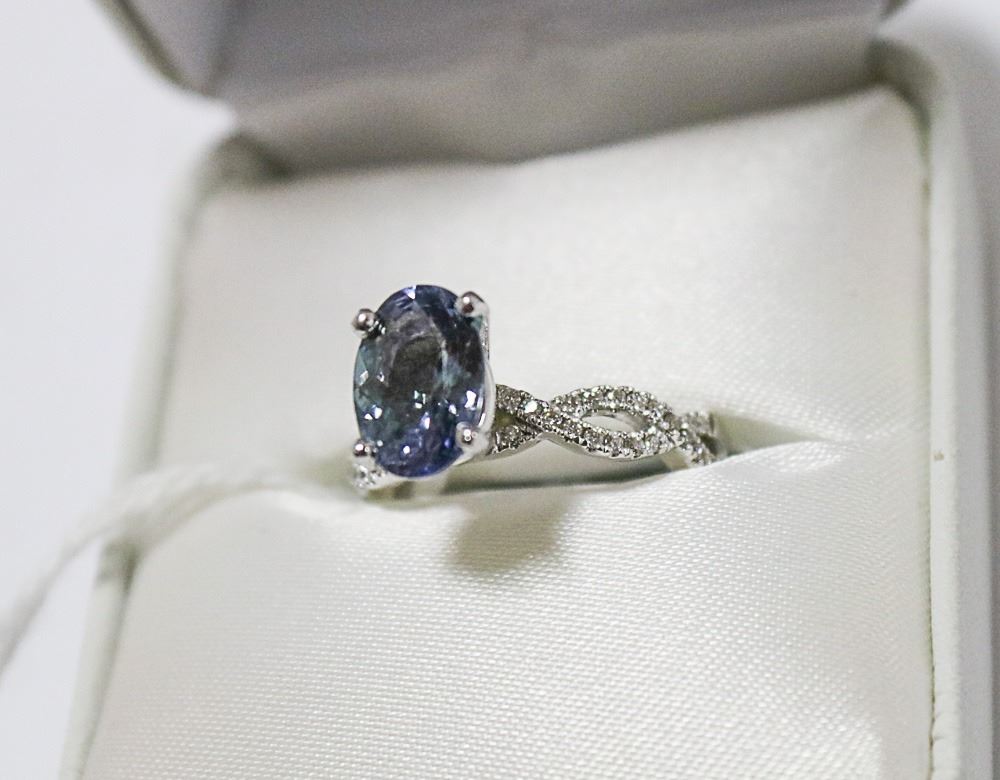 ONE 14K WHITE GOLD TANZANITE AND DIAMOND RING. TANZANITE WEIGHS 2.18 CARAT, VS1 CLARITY. 40 ROUND DIAMONDS, VS-SI, COLOUR G-H, .30. SIZE 5.25 APPRAISED AT $3600.00