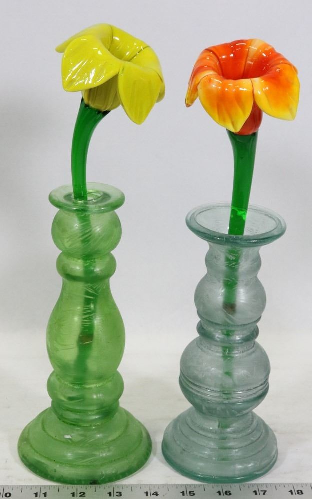 2 BLOWN GLASS FLOWERS NAD 2 GLASS VASES