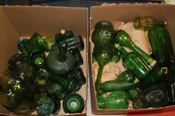 2 BOXES OF GREEN GLASS ORNAMENTS