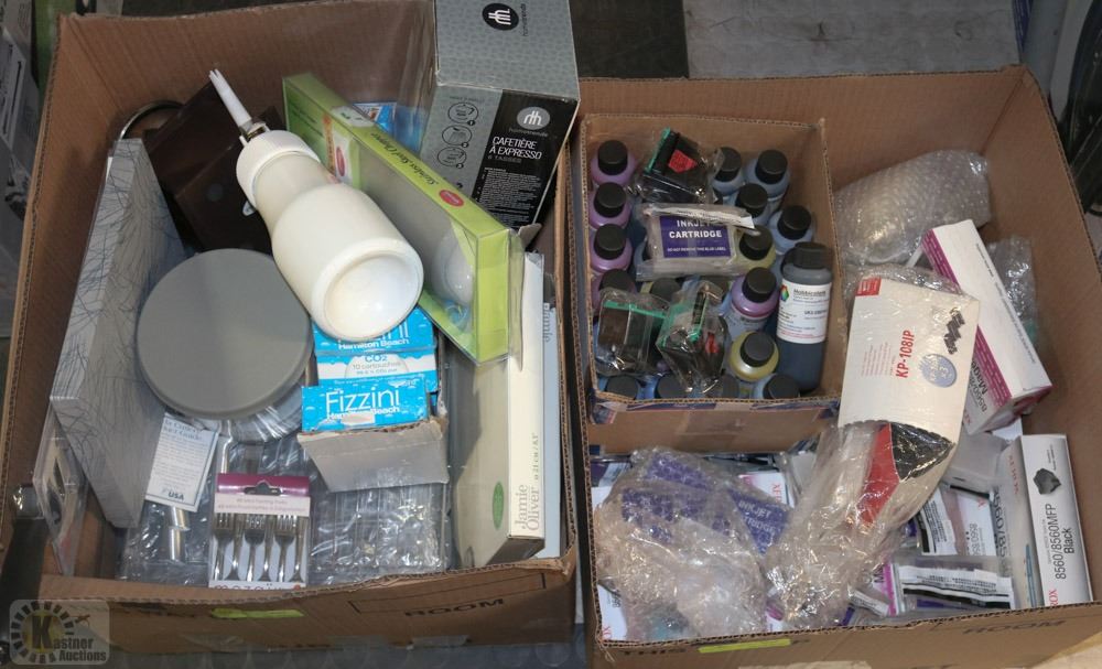 2 BOXES WITH INK, INK REFILL AND KITCHEN SUPPLIES