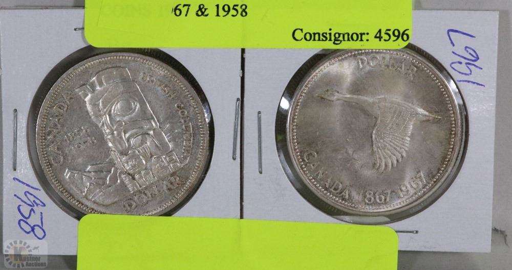 2 CANADIAN SILVER $1 DOLLAR COINS 1967 & 1958