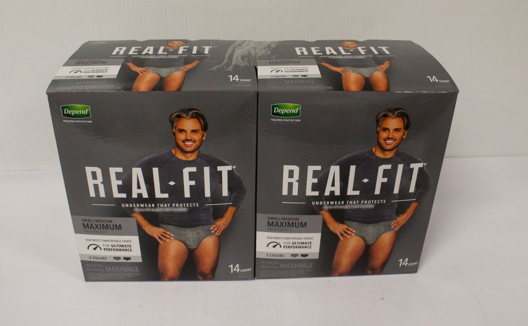 2 CASES OF DEPEND REAL-FIT S/M UNDERWEAR MAXIMUM ABSORBENCY. 14 PER CASE 28 TOTAL