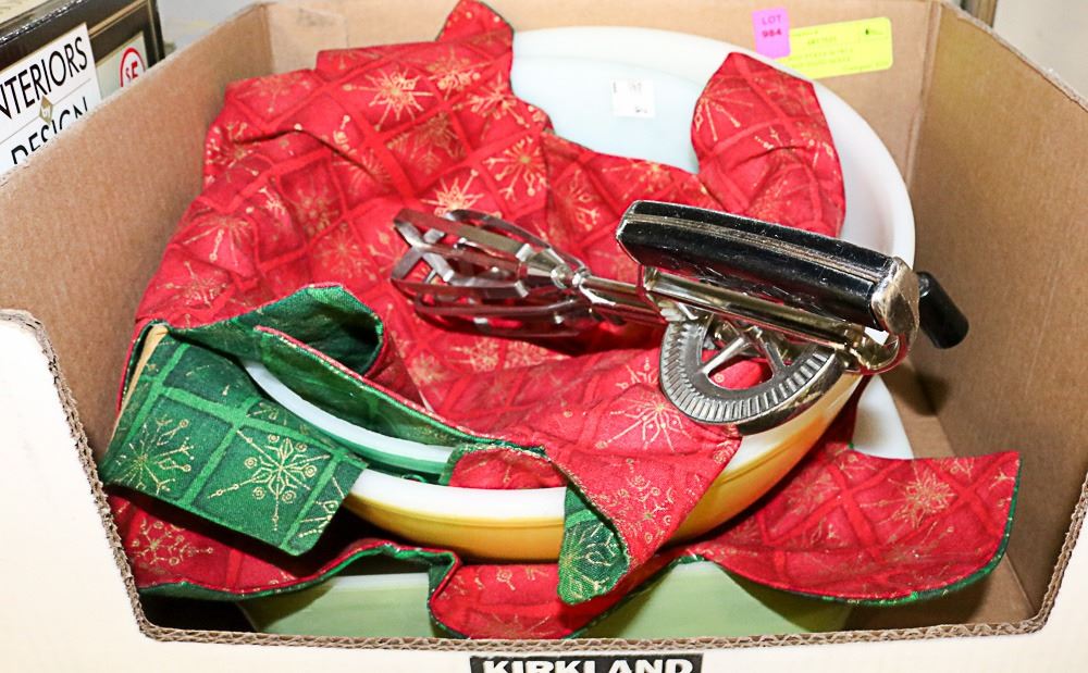2 COLORED PYREX BOWLS W/VINTAGE HAND MIXER