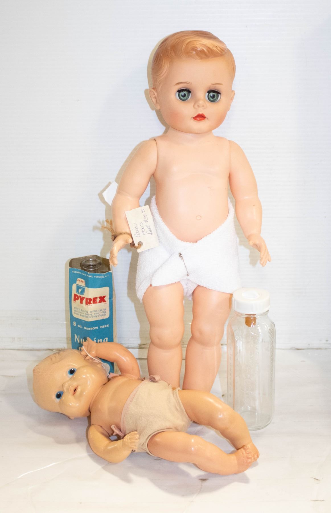 2 DOLLS, 2 BABY GLASS BOTTLES CIRCA 1940'S
