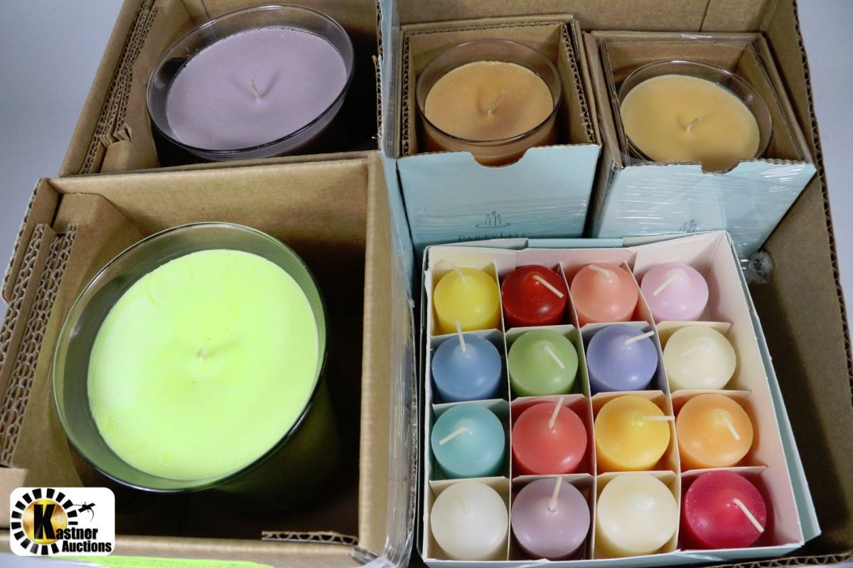 2-HURRICANE JAR CANDLE, 11.4 OZ BARREL JAR,6.7 OZ TRUMPET JAR AND 1 BOX OF 12 ASSORTED SCENTED VOTIVE CANDLES