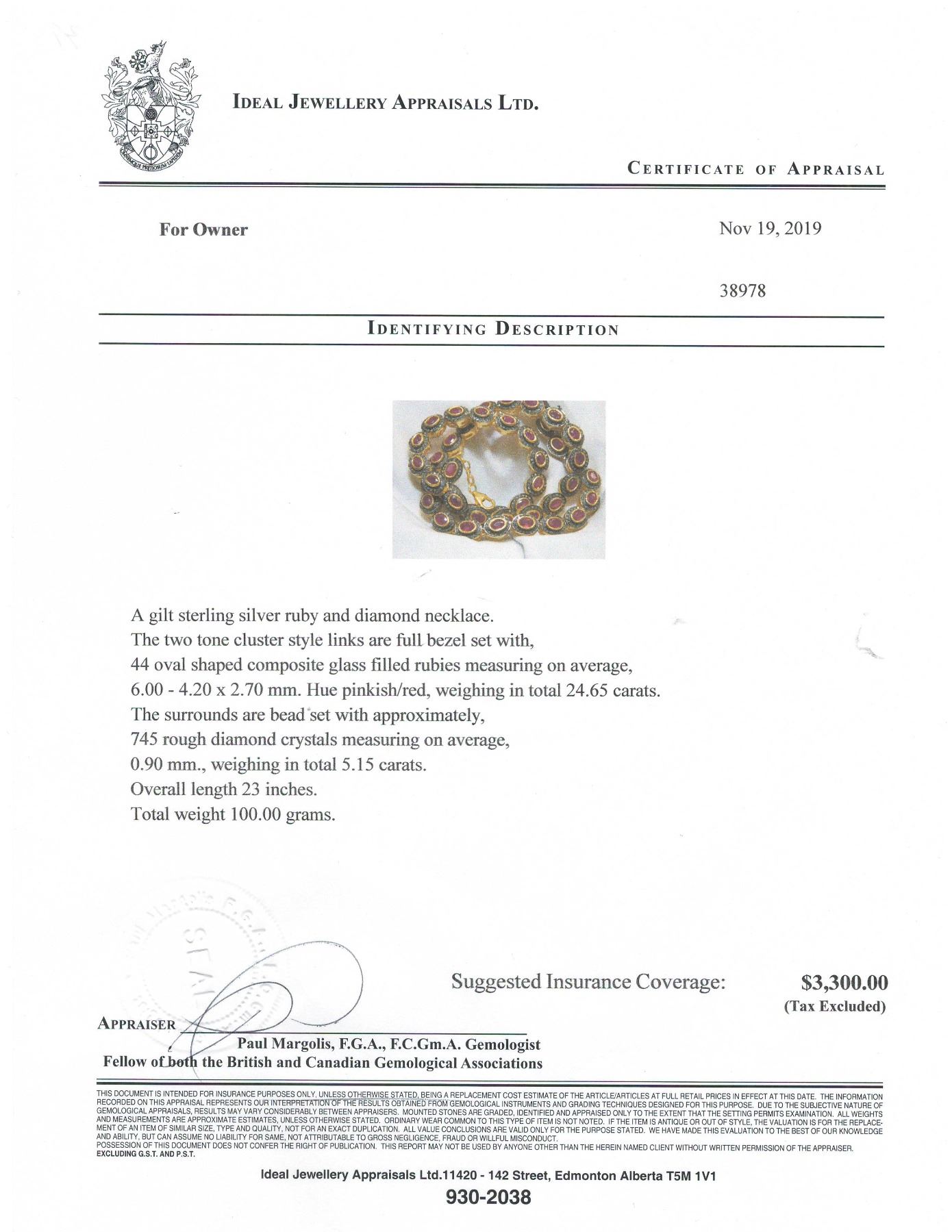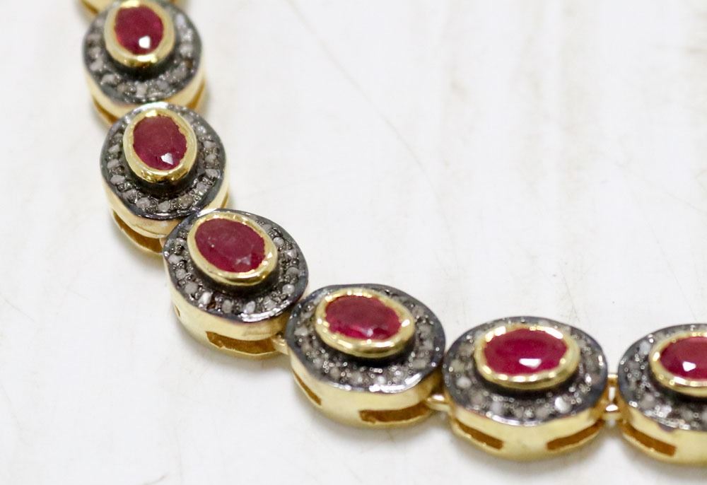 WITH LOCAL APPRAISAL 44 OVAL SHAPED COMPOSITE GLASS FILLED RUBIES, RUBIES WEIGHT 24.65 CARATS, 745 ROUGH DIAMOND CRYSTALS WEIGHING TOTAL OF 5.15 CARATS, OVERALL LENGTH IS 23 INCHES, TOTAL WEIGHT 100.00 GRAMS. SUGGESTED INSURANCE COVERAGE $3,300.00. JEWELLERY