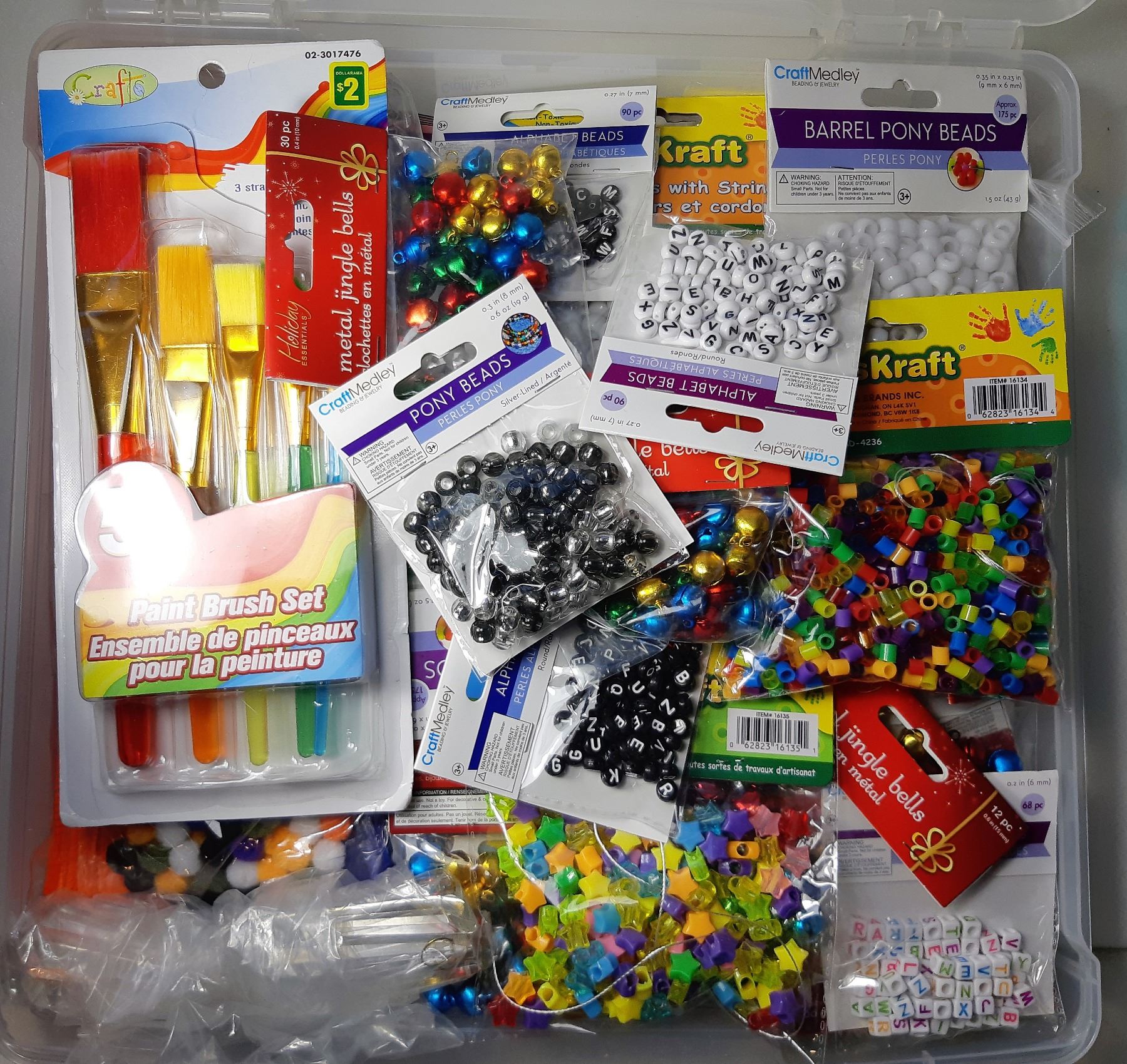 INCLUDES: ALPHABET BEADS, PAINT BRUSH SET, COLORED BELLS, GOOGLY EYES, COLORED PIPE CLEANERS & MORE. CRAFTS