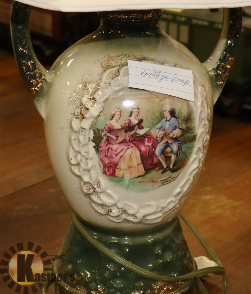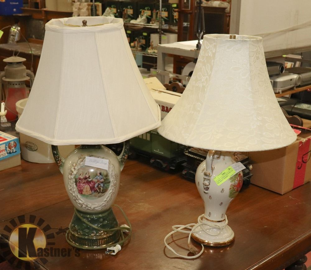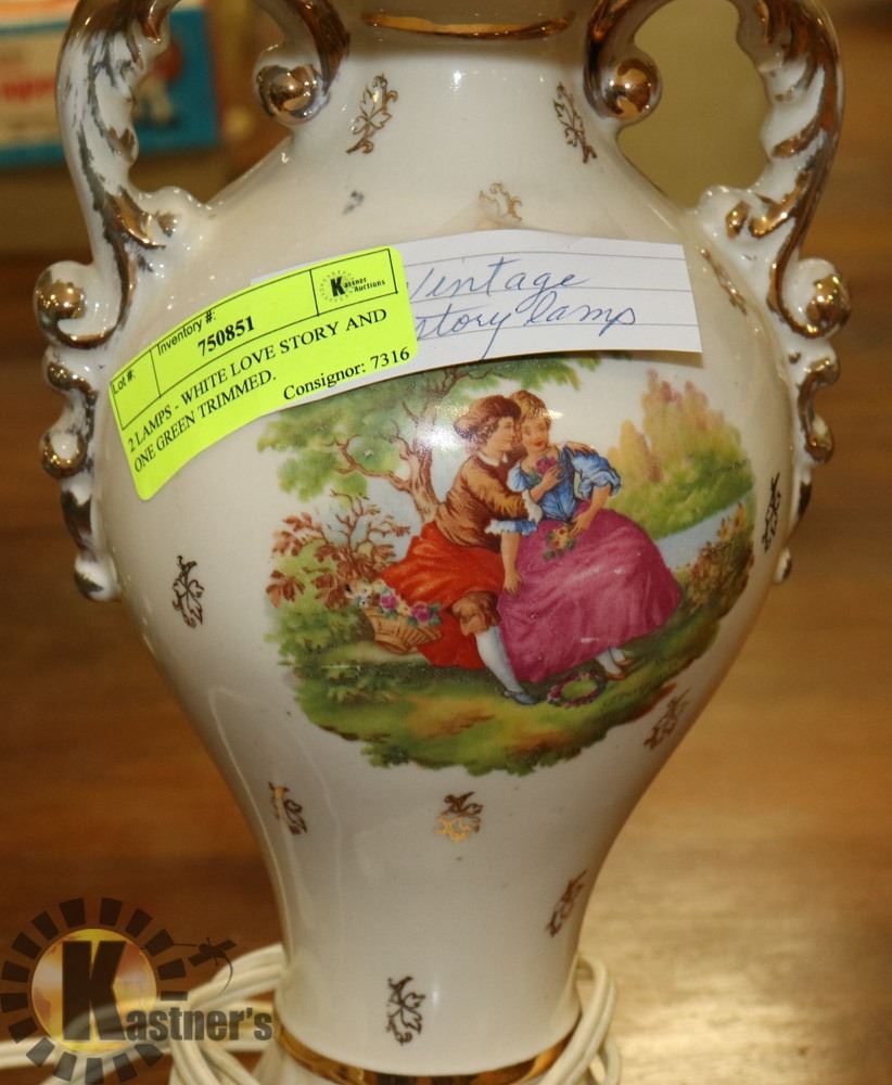 2 LAMPS - WHITE LOVE STORY AND ONE GREEN TRIMMED.