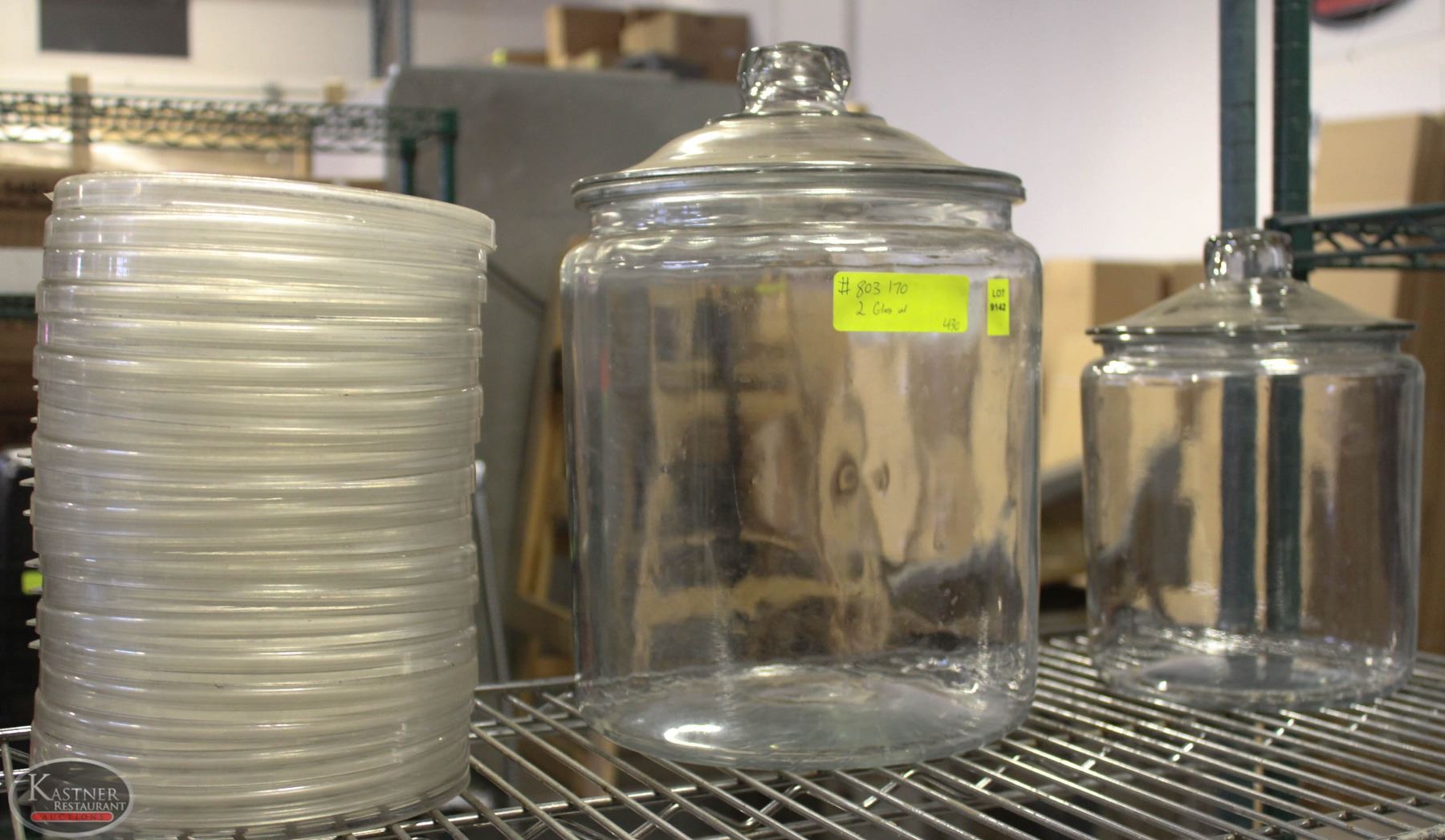 2 LARGE GLASS COOKIE JARS W/ 21ROUND CAMBRO 6" LID