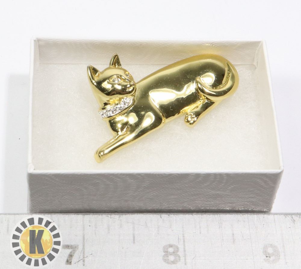 JEWELED EYES AND COLLAR, GILT COSTUME BROOCH IN NEAR MINT CONDITION. VINTAGE. ***ITEM LOCATED IN LETHBRIDGE AB